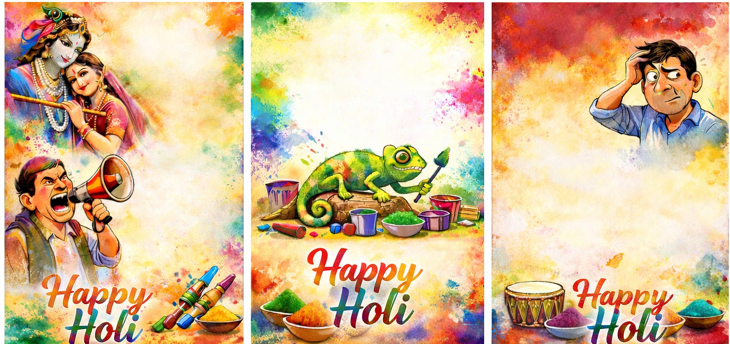 इस होली, हम सबको आपस में जुड़कर कुछ बेहतर करने का संकल्प लेना है। भारत में एक अति-विशेष प्राणी समुदाय भी है, जो दिन-रात भारत बदलने की बातें करता है—पर बदलते हैं सिर्फ बयान। उन्हें करने दीजिए; आखिर इसी बहाने उनकी रोज़ी-रोटी चलती है। कभी चाटुकारिता, कभी कानों में फुसफुसाहट, और जब कुछ हाथ न लगे तो बिना आधार के आरोप—काम उनका नहीं, पर धंधा पूरे ज़ोर-शोर से चलता रहता है। और हाँ, होली में गिरगिटिया रंग खेलने वालों से थोड़ा फ़ासला बनाए रखें। उन्हें प्यार से समझाइए कि रंग खेलने से पहले दिमाग़ पर चढ़े रंग भी ज़रा धो लेने चाहिए। दिखावे की क्रांति से देश नहीं बदलता; देश बदलता है जब नागरिक अपने गाँव और मोहल्ले की ज़िम्मेदारी उठाते हैं। आजकल कुछ विशेष प्राणी हर विषय के सबसे बड़े विशेषज्ञ बन बैठे हैं, जबकि उस विषय से उनका दूर-दूर तक कोई संबंध नहीं होता। इन तथाकथित विशेषज्ञों से पूछा जाना चाहिए—आपने आख़िरी बार किया क्या था?